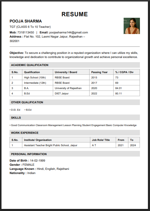 Whether you are a fresher, experienced teacher, CTET-qualified candidate, B.Ed student or school principal, a strong resume increases your chances of getting shortlisted faster.