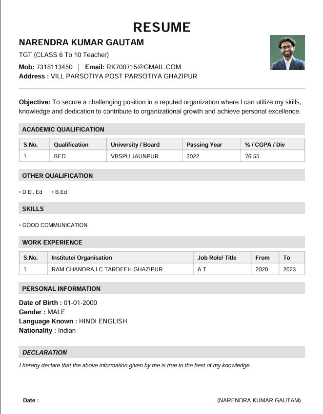 Job-ready resume format (for fresher and experienced teachers)