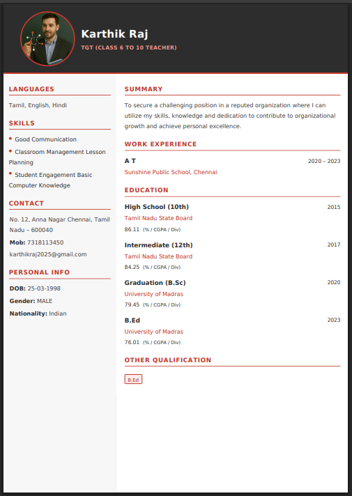 Use the SchoolNaukri Teacher Resume Maker to create a clean, simple, and job-ready resume trusted by schools across India.
